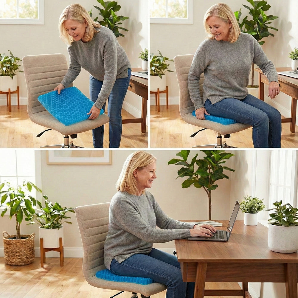 Stundenlanges Sitzen erzeugt Druckpunkte an Steißbein und Hüfte. Die Waben verteilen dein Körpergewicht gleichmäßig und entlasten sofort. 94% spüren den Unterschied in der ersten Woche.