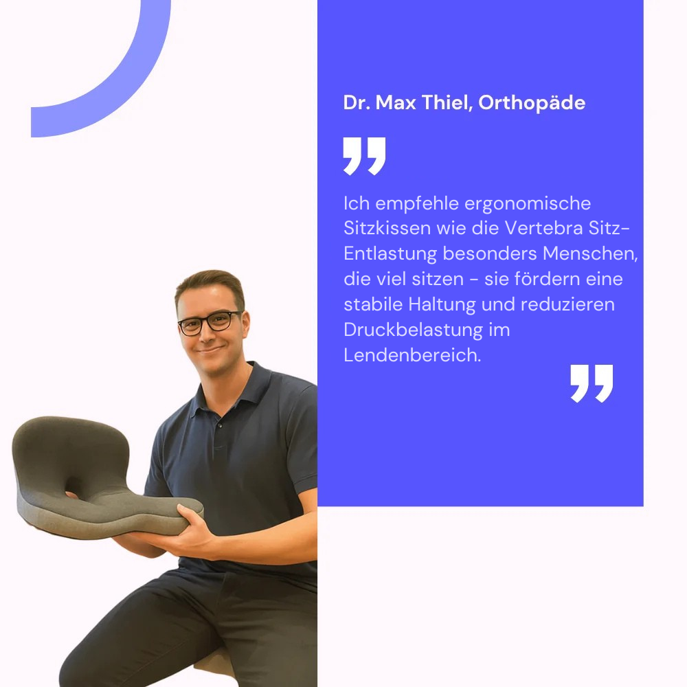 Orthopäden empfehlen daher ergonomische Sitzhilfen, um Druck auf die Wirbelsäule zu reduzieren und eine gesunde Haltung zu fördern.